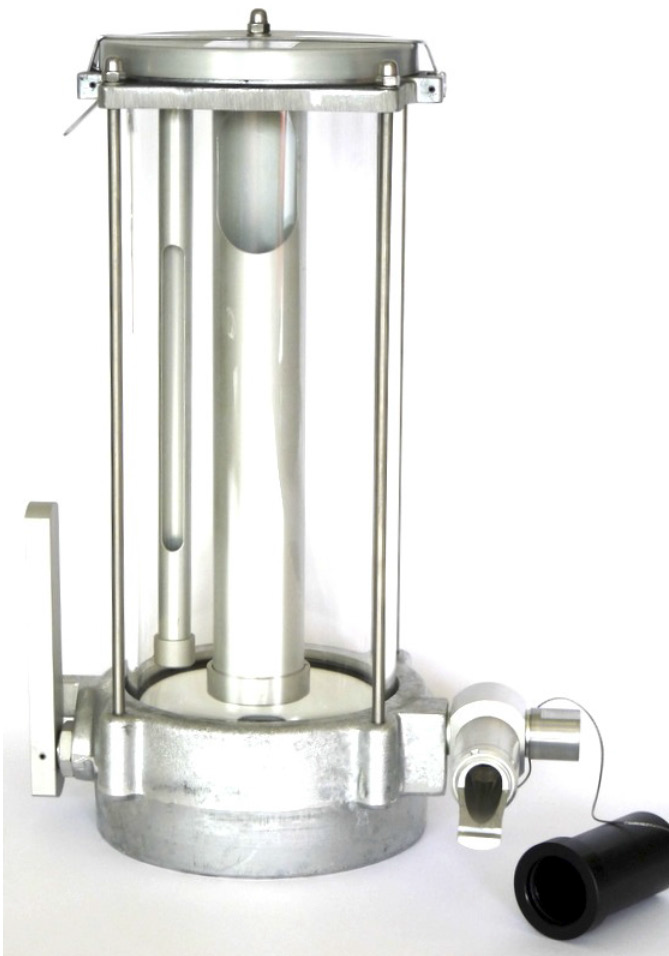 Герметичный стакан из прозрачного стекла специально разработан для систем взятия проб чистых светлых нефтепродуктов при предъявлении высоких требований к наличию загрязняющих примесей и воды в составе авиационных топлив. Стакан состоит из прозрачной стеклянной трубки, установленной на коническом основании с белым эпоксидным покрытием, что облегчает обнаружение грязи и воды в пробе, с откидной вентилируемой крышкой. Отбираемый продукт заходит через впускное отверстие по касательной к основанию, что усиливает его перемешивание и закручивание в нижней части стакана. Выпускной клапан основания изготовлен из нержавеющей стали и имеет глухое соединение. Такая конструкция стакана концентрирует присутствующие примеси в центральной части основания, что существенно облегчает обнаружение загрязнений. После визуального осмотра и контроля, проба топлива спускается через дренажный клапан, имеющий ручное управление. Внутренняя очистка стакана легко осуществляется через откидную крышку.